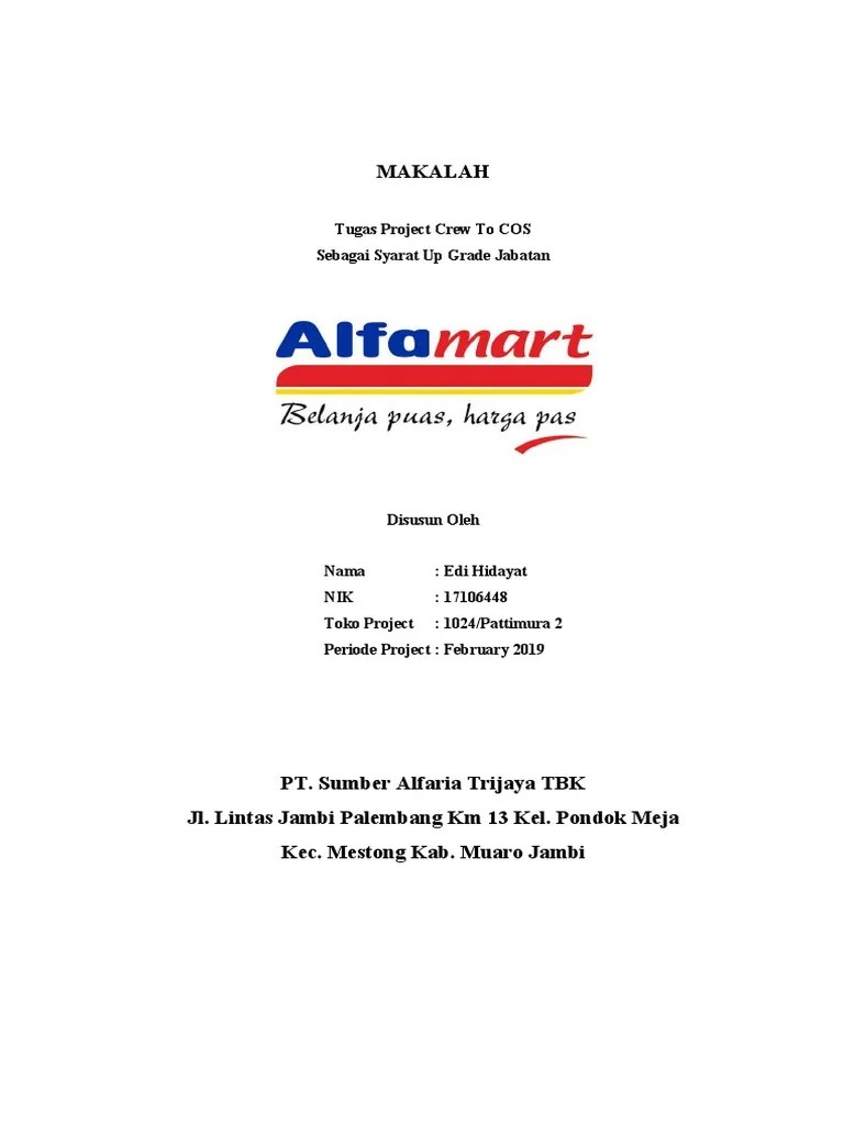 Membuat makalah yang bertemakan tentang alfamart. Metode penelitian yang digunakan adalah dengan metode penelusuran langsung kesuatu toko alfamart, metode pengumpulan makalah ini dari karyawan . Puji tuhan kehadirat tuhan yang maha kuasa atas segala rahmat, karunia terutama . Tawarkan promo pdm atau jsm. Sarana promosi yang digunakan untuk semple barang jsm ataupun pdm. Bm, dbm dan pdm alfamart bali atas bantuan dan dukungannya. Mekanisme promosi jsm dan pdm jsm. Sumber alfaria trijaya tbk (alfamart ciluar). Makalah ojt alfamart sebagai crew. Atau indomie ayam bawang 709 pdm krating daeng belanja senilai rp10.000 bisa beli . Selama proses penulisan makalah ini, penulis mendapatkan banyak. Download & view makalah alfamart as pdf for free. Membuat makalah alfamart itu lebih dulu.